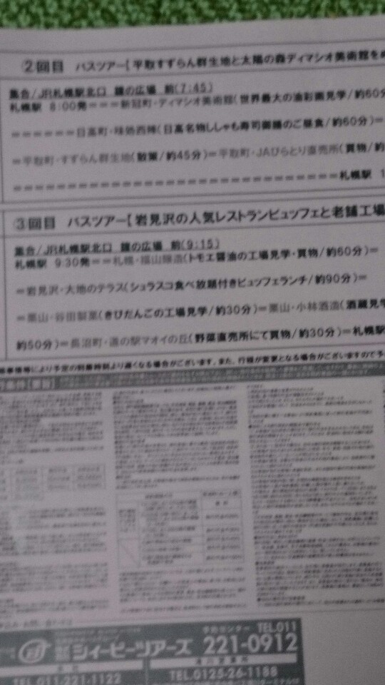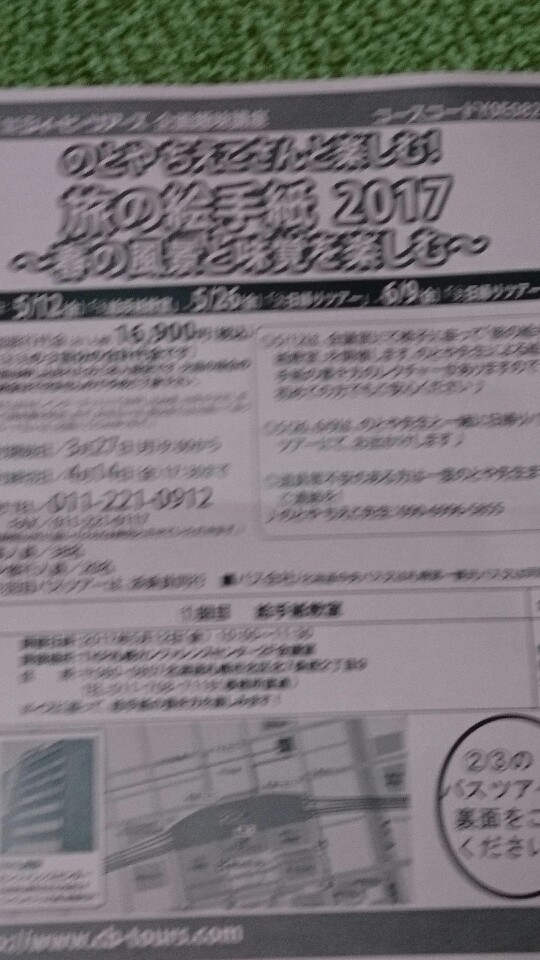 chieko-mobile 2017年3月2日 今年も旅の絵手紙ツアーができました。 装いも新たに三回コースです。 雪が溶けたら さあ楽しいこと しましょうね~ パンフレットは順次 教室に持っていきますね。検討してみてくださ~い‼ ← ウェルカム北海道 ちらしずし → コメント “旅の絵手紙ツアー” 画面がぶれちゃって とても見づらいことになっていますが 訂正の仕方を習っていませんでした~ごめんなさい! お手数ですが直接問い合わせてくださいね。 011-221-0912 シービーツアーズさんです。 コメントは締め切りました。