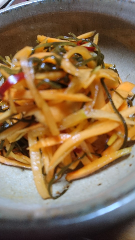 あと、ひたすら細い千切りにして半分は冷凍庫へ入れ、あとは昆布とめんつゆにつけました。