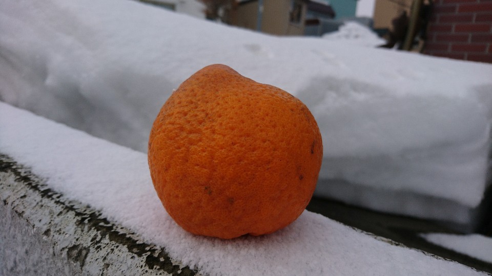 今朝の雪にたんかんが映えています。