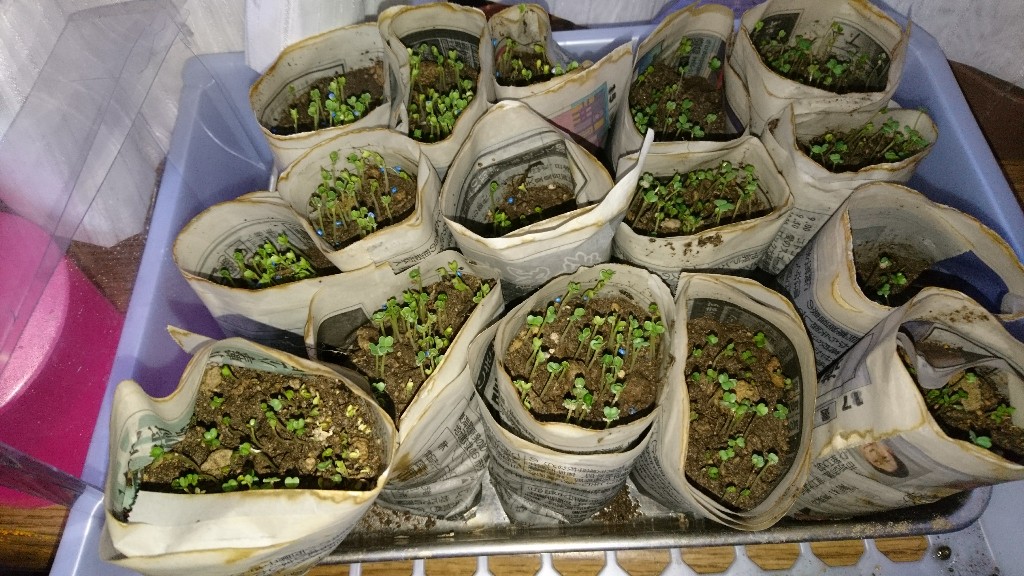 新聞で作った小さな鉢で 一斉に芽がでました。