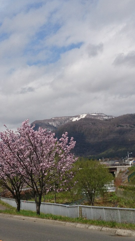 まだ 雪が残っている手稲山と桜です。