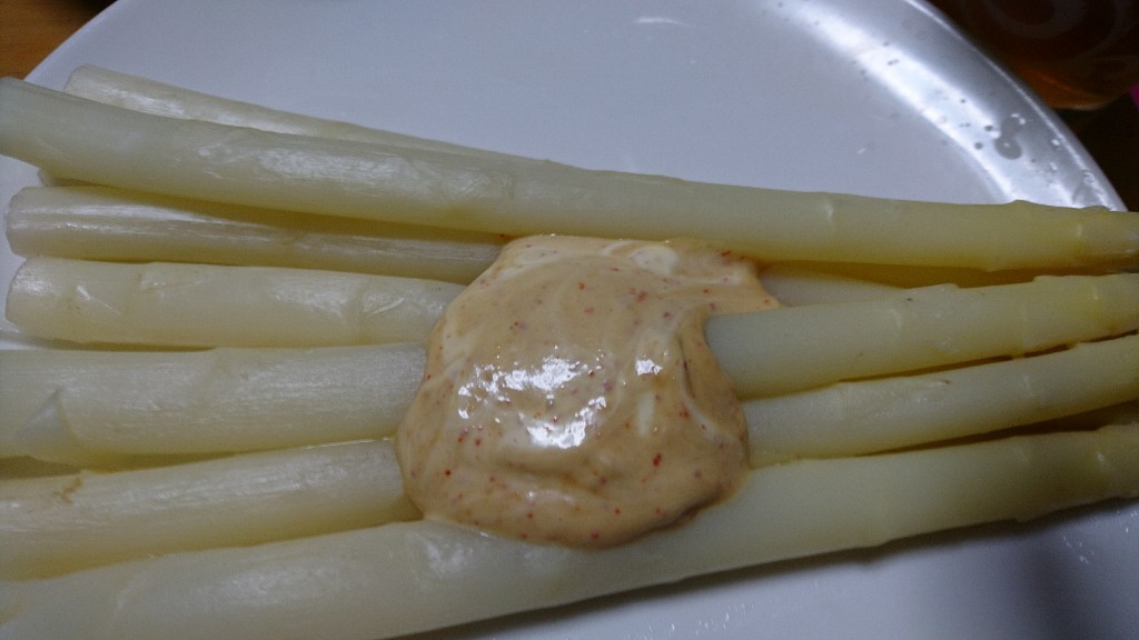 帰宅してすぐに、水の駅で買ったホワイトアスパラをさっとゆでて 味噌マヨネーズで食べました。