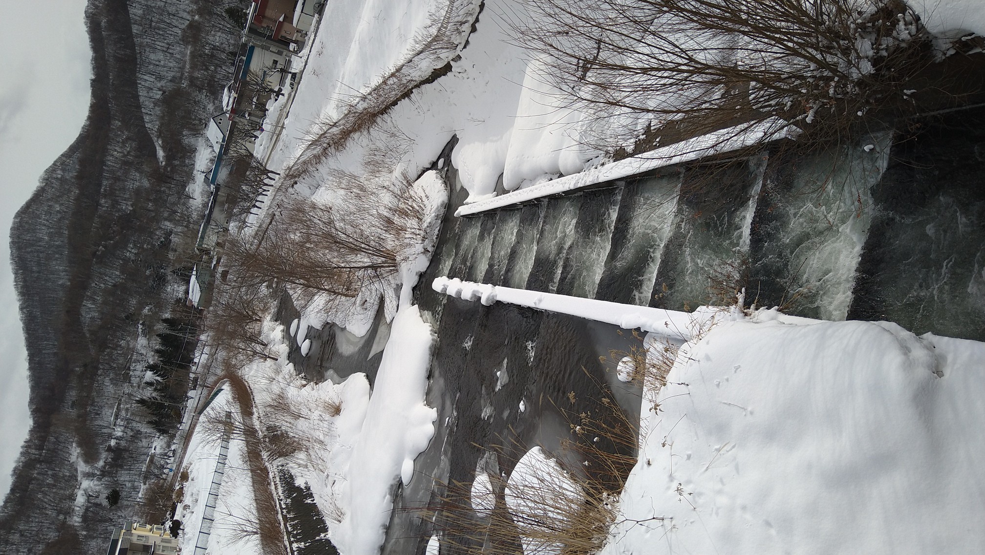 吹雪の合間にポストまで行くと、いつの間にか川が開けていました。