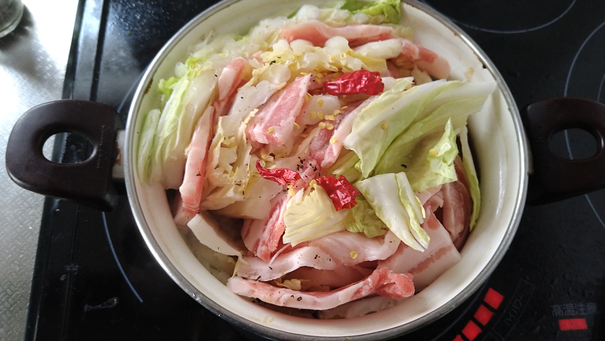 白菜と豚肉を、コトコトと30分、只今白だしで煮込んでいます。