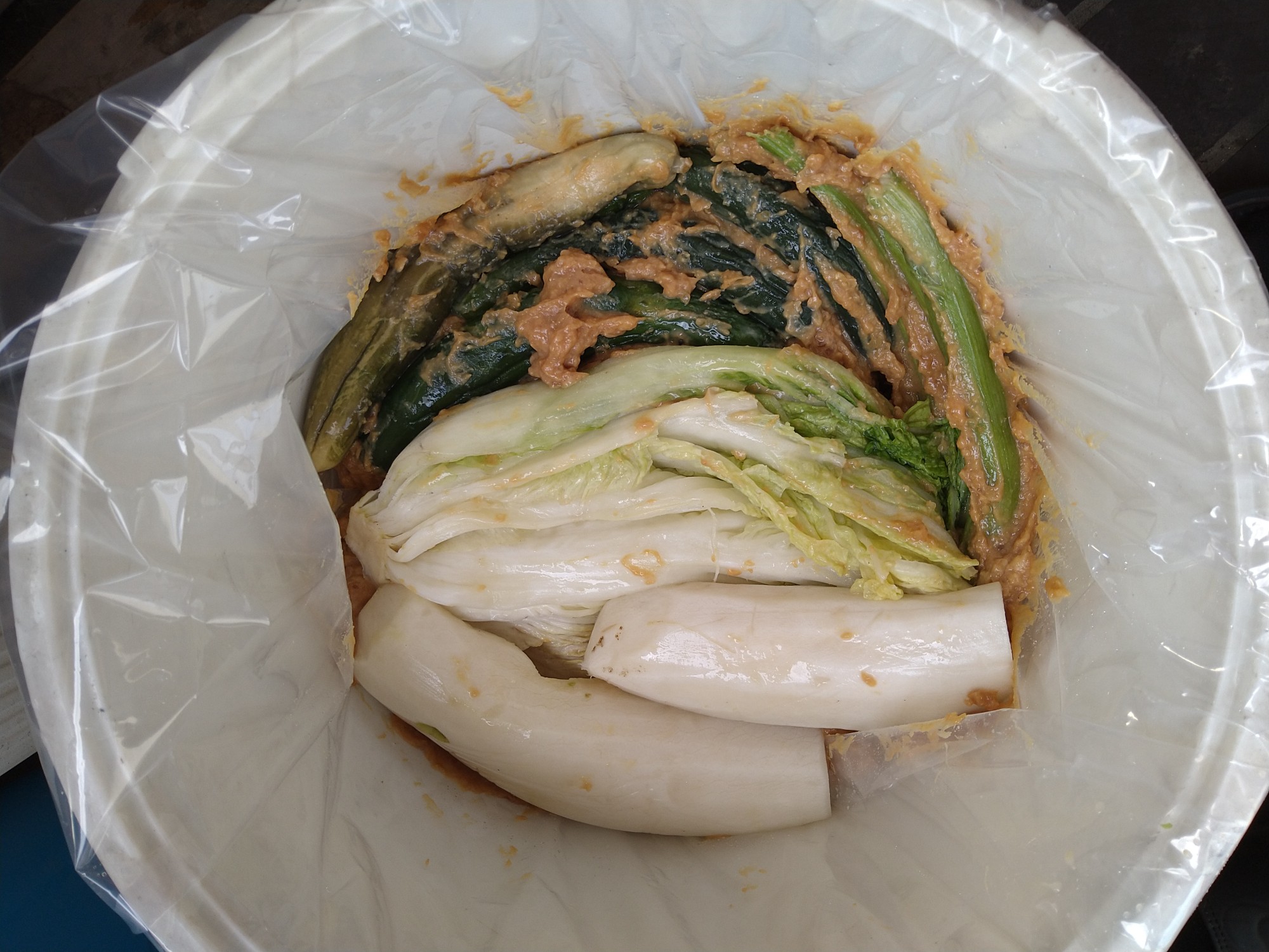 chieko-mobile 2021年11月1日 あら漬けをしていた野菜を本漬けにしました。 一つの樽に、我が家の大根、きゅうり、頂いたセロリ、白菜を入れたのは初めてです(笑) それぞれ塩出ししたり塩漬けしたりして、いつもの酒粕と味噌と砂糖でつけました。 昨年も大根と人参を一緒にしたけどおいしかったので大丈夫でしょう!(笑) あと、白菜漬けと大根がりっぱだったので、二本ほど日持ちのする酢漬けを作りました。 旅の受付で緊張していたのを忘れていました(笑) ← 日帰り旅 小樽日帰りの旅 →