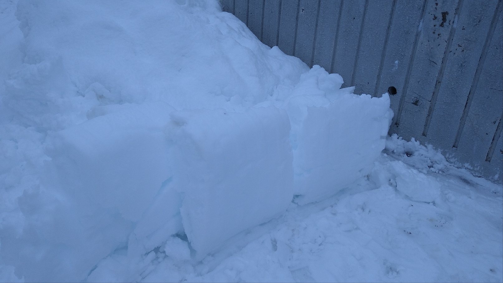 寄せた雪がこんなふうに固まることは殆どないのに、しかもなぜかかたまりの雪が水色に見えます。