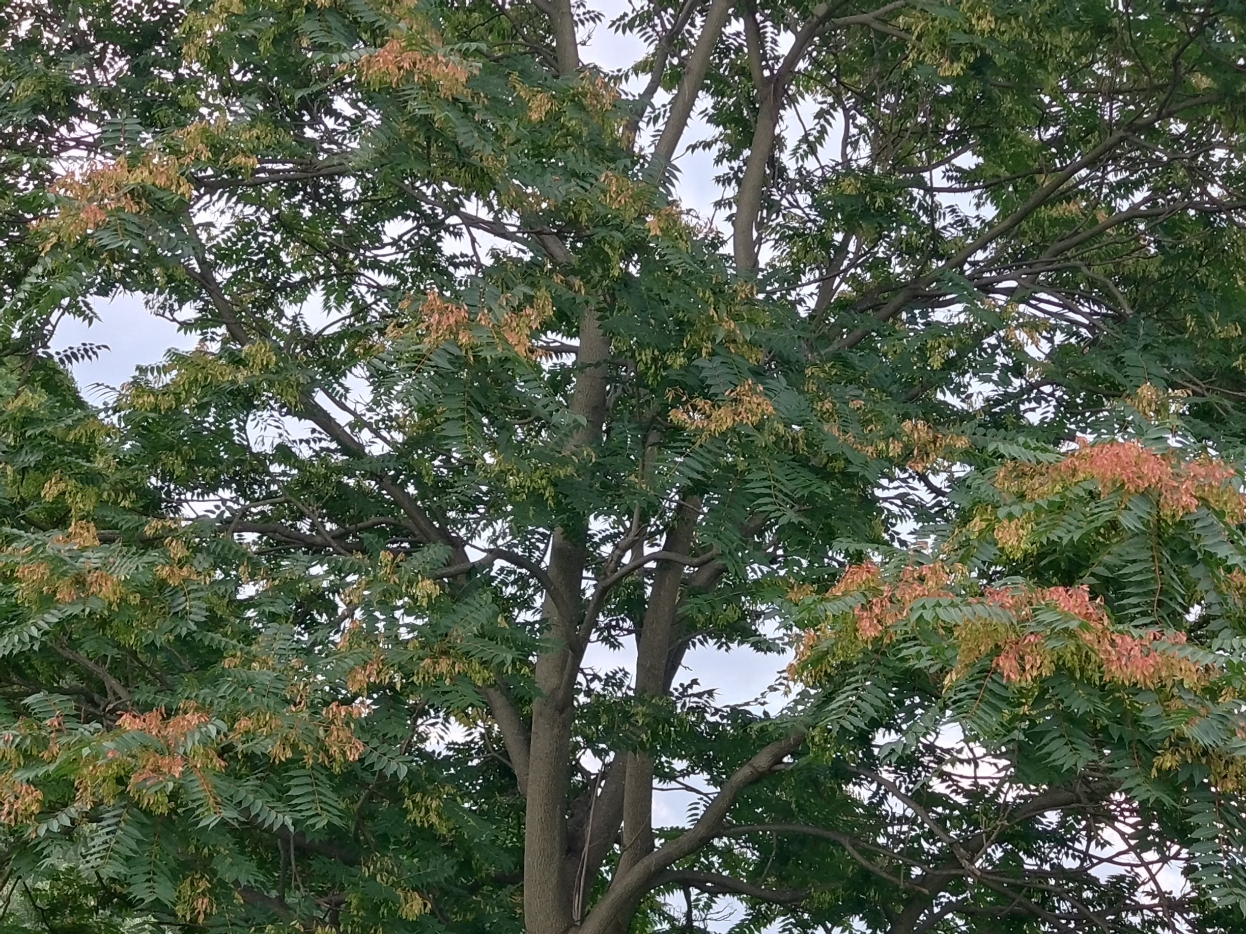 ニワウルシの大木はオレンジと緑の花?芽?果実?を咲かせて凄い迫力です。