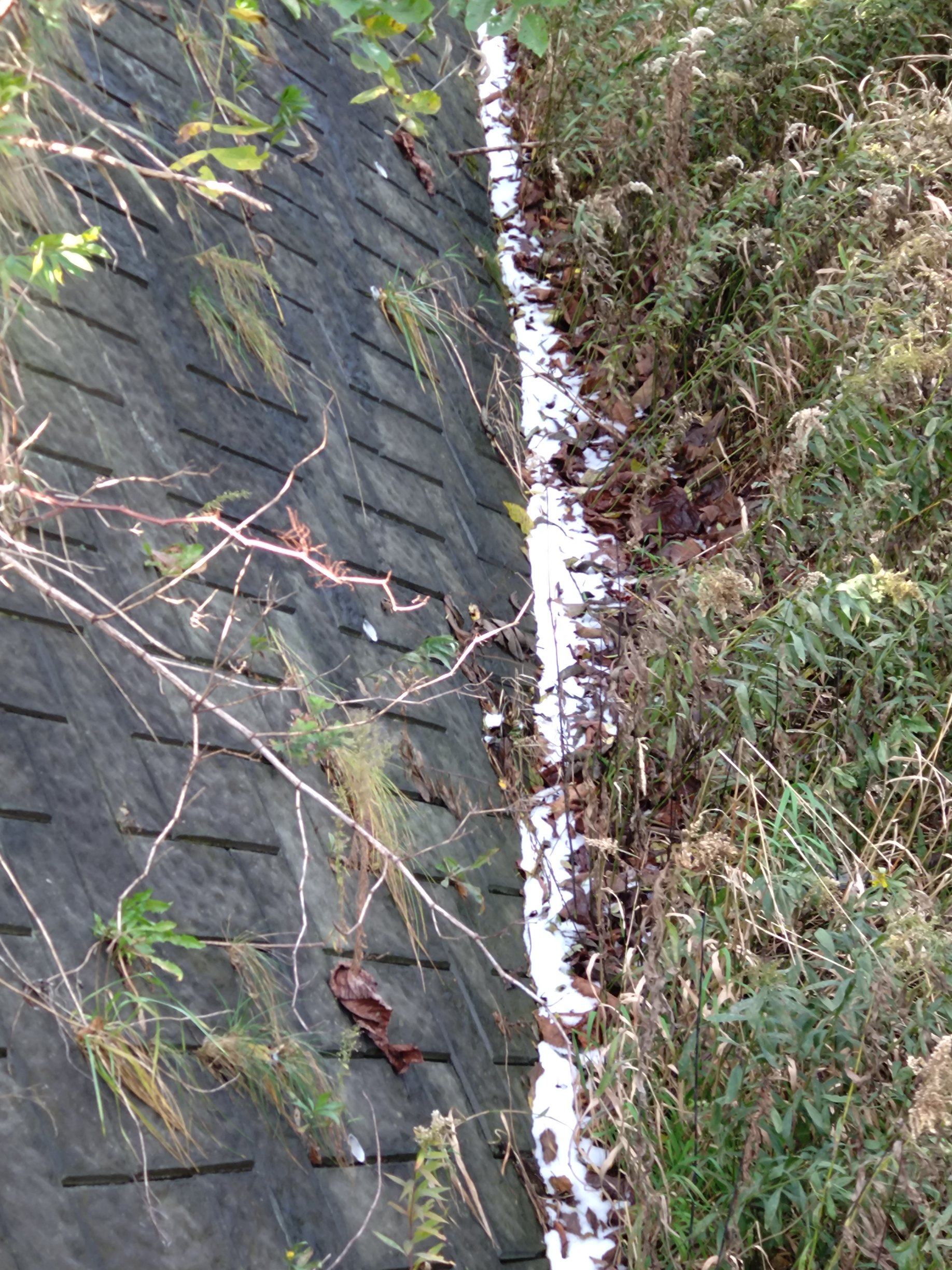 山っ子橋から山頂の写真を写して、ふっと下を見るとコンクリートと雑草の川岸の間に雪が、積もっていました。
