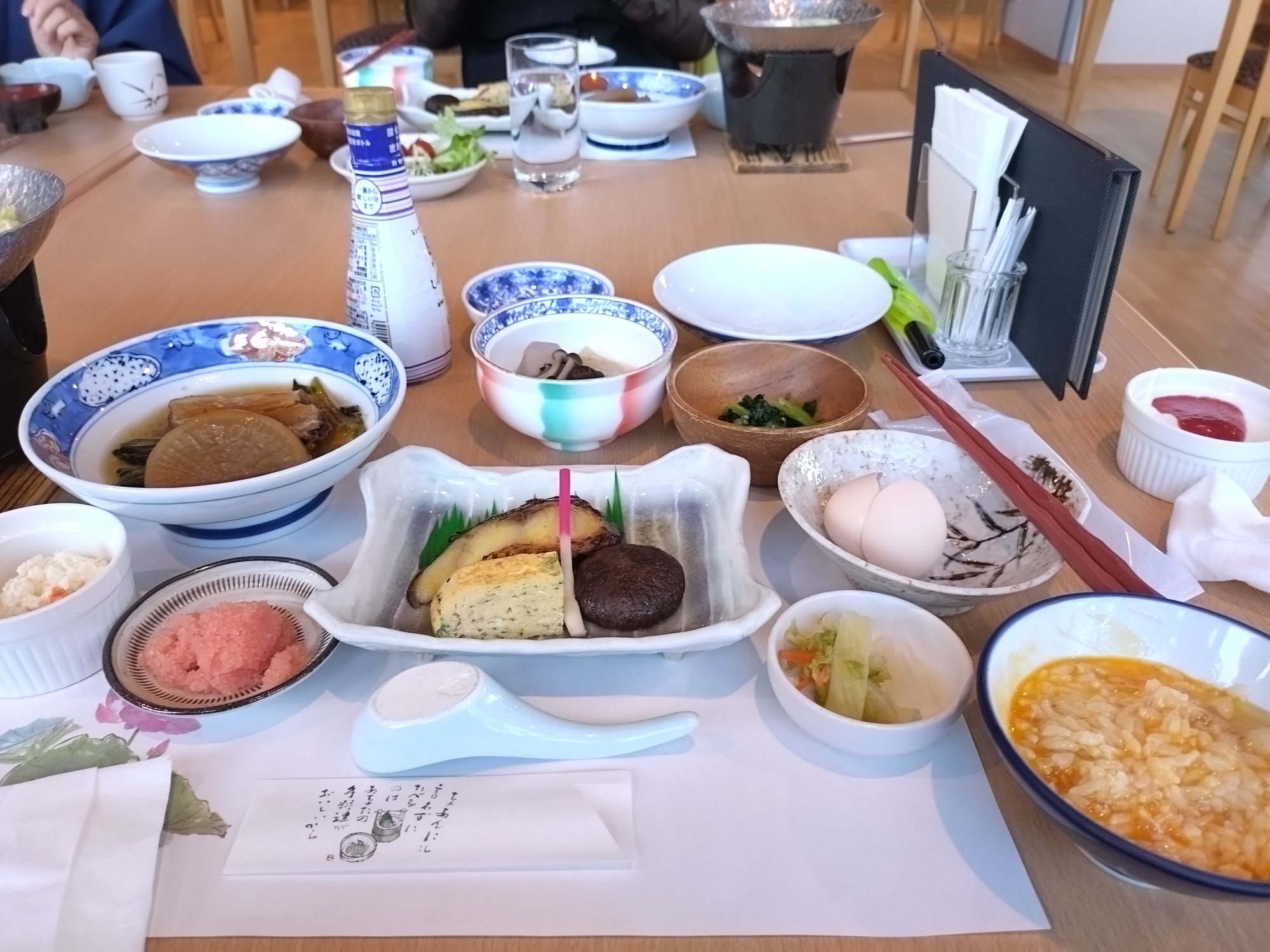 野菜ビッフェに近くのマザーズの卵食べ放題やプチプチの上等なタラコなどの朝ごはんでした。