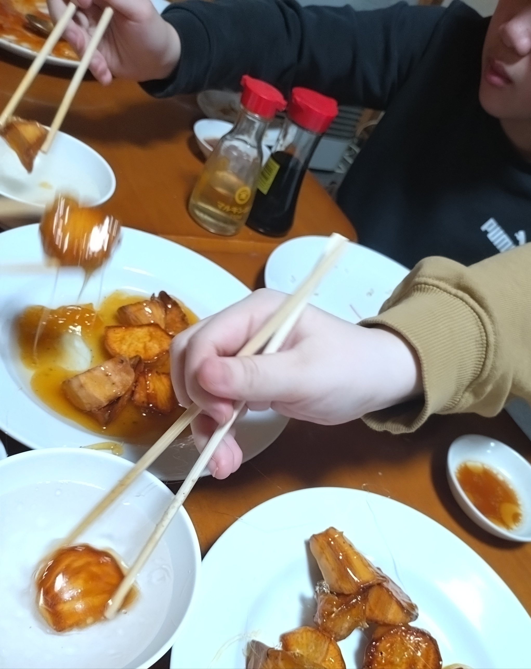 まもなくたっぷりの飴に埋もれた大学芋が来ました!「もう固まりはじまってますよー!早く!」と店員さんの合図で子供達は間髪入れずに水に入れて固めます!