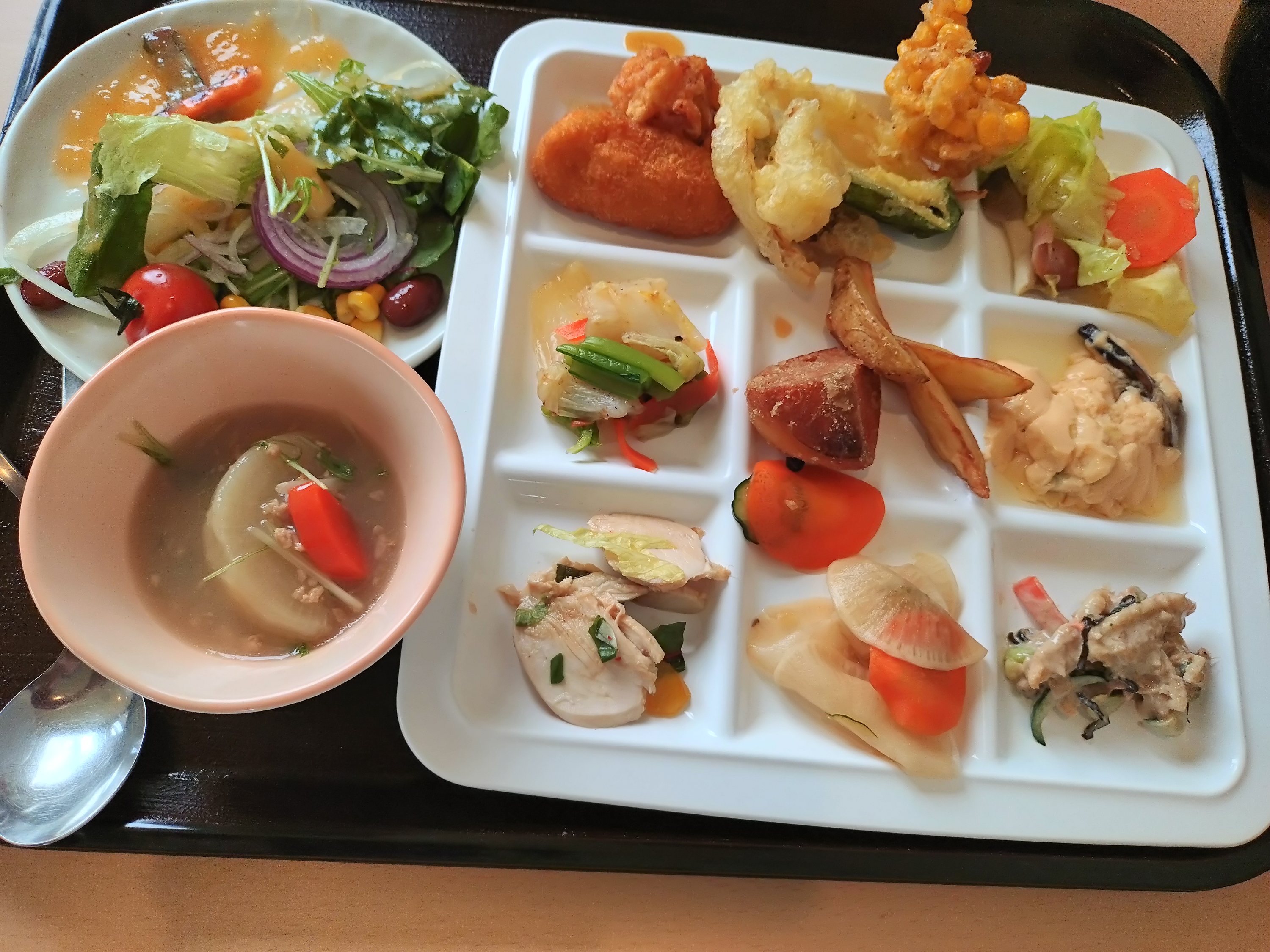 chieko-mobile 2025年4月24日 ランチは大人気の「くるるの杜」にある農村レストランで野菜のビュッフェです。 このきれいな盛り付けはお向かいの人ので 私のではありません(笑) 久々にお腹いっぱい食べました。 ホクレン直営店で隣にはとれとれ野菜の販売所があり、アスパラなどを買いました。 ← 日帰りツアー 次の旅! →