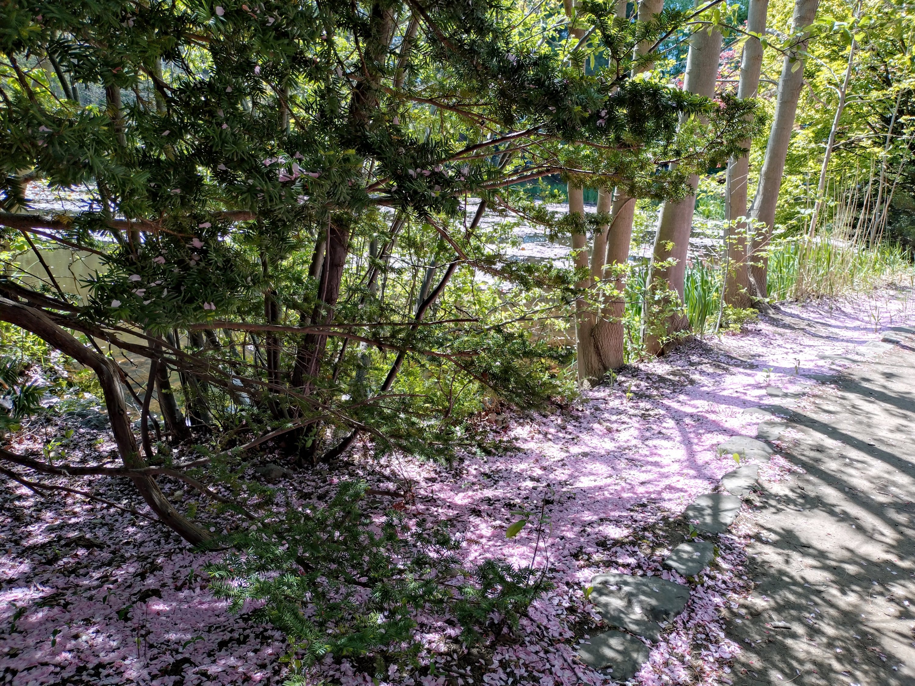 道庁前のあんなに、満開だった八重桜が 今日は花びらのじゅうたんになっていました。