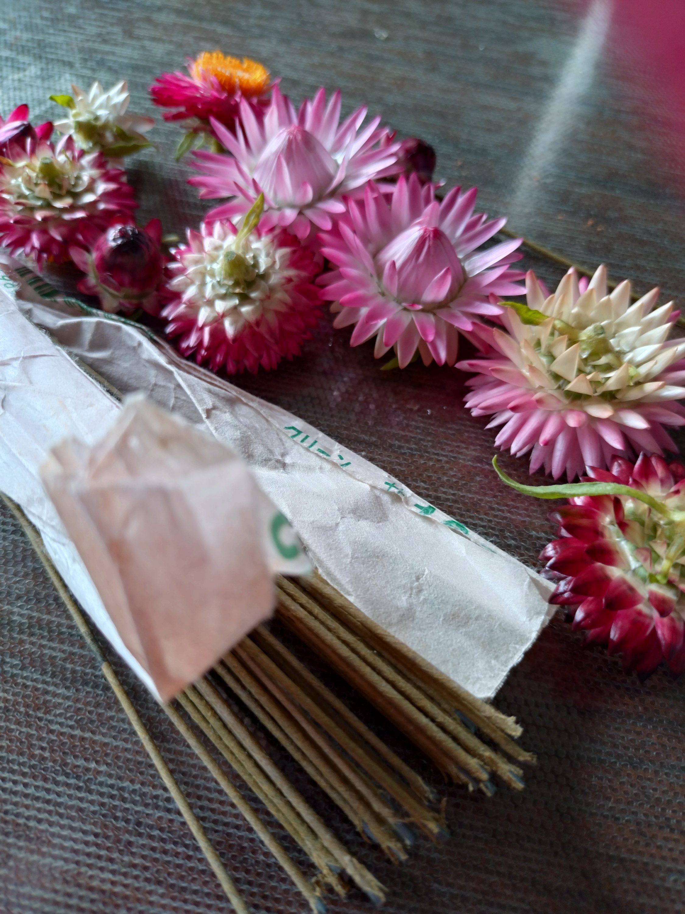 そのままドライフラワーになるから、針金を通して作ってね、と鉢からお花を切ってくれました。