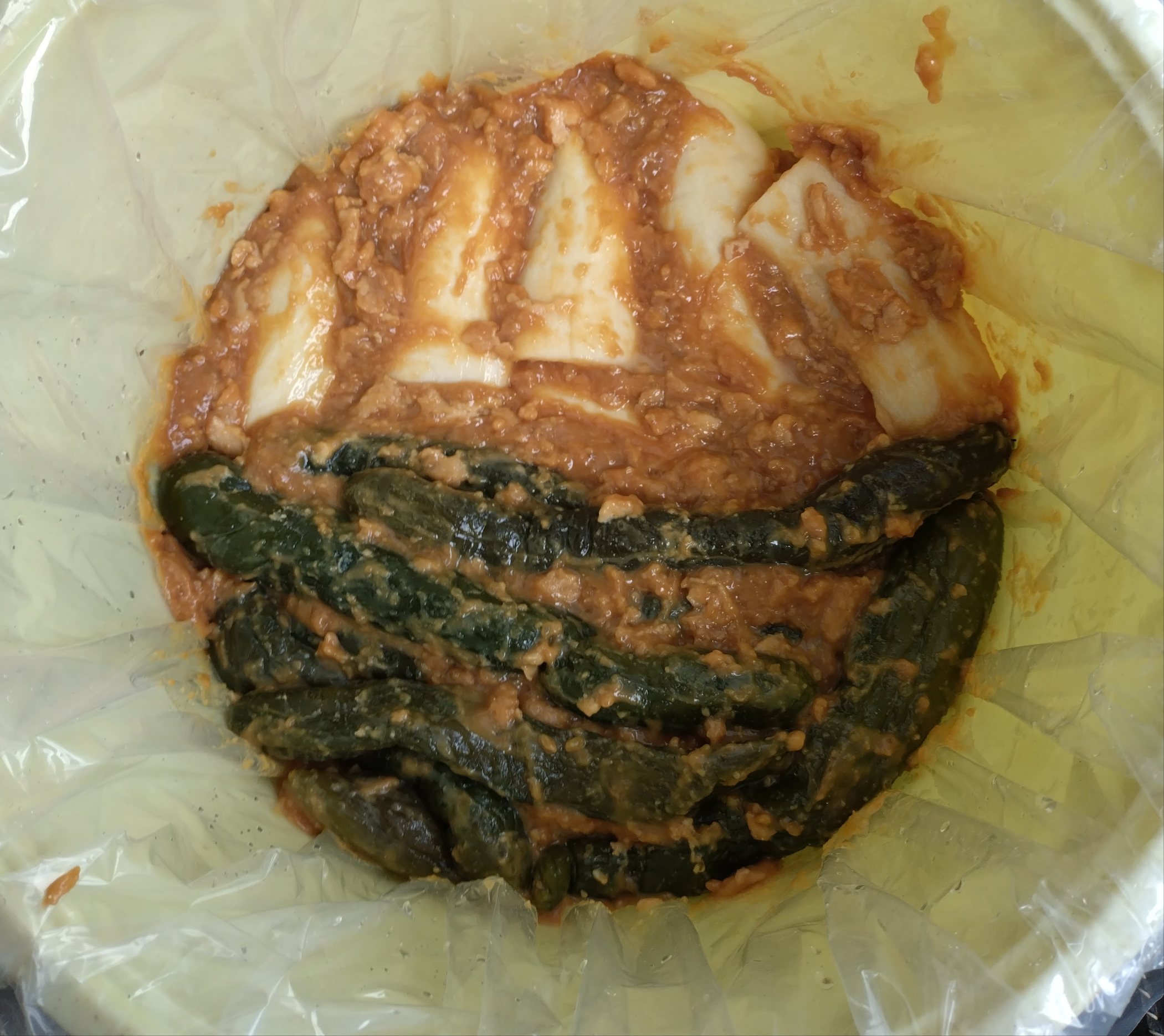 皮をむいて干していた大根を荒漬け(下漬け)して2日目、昨夜は水を捨てて抜くために重しをして、粕味噌漬けにしました。