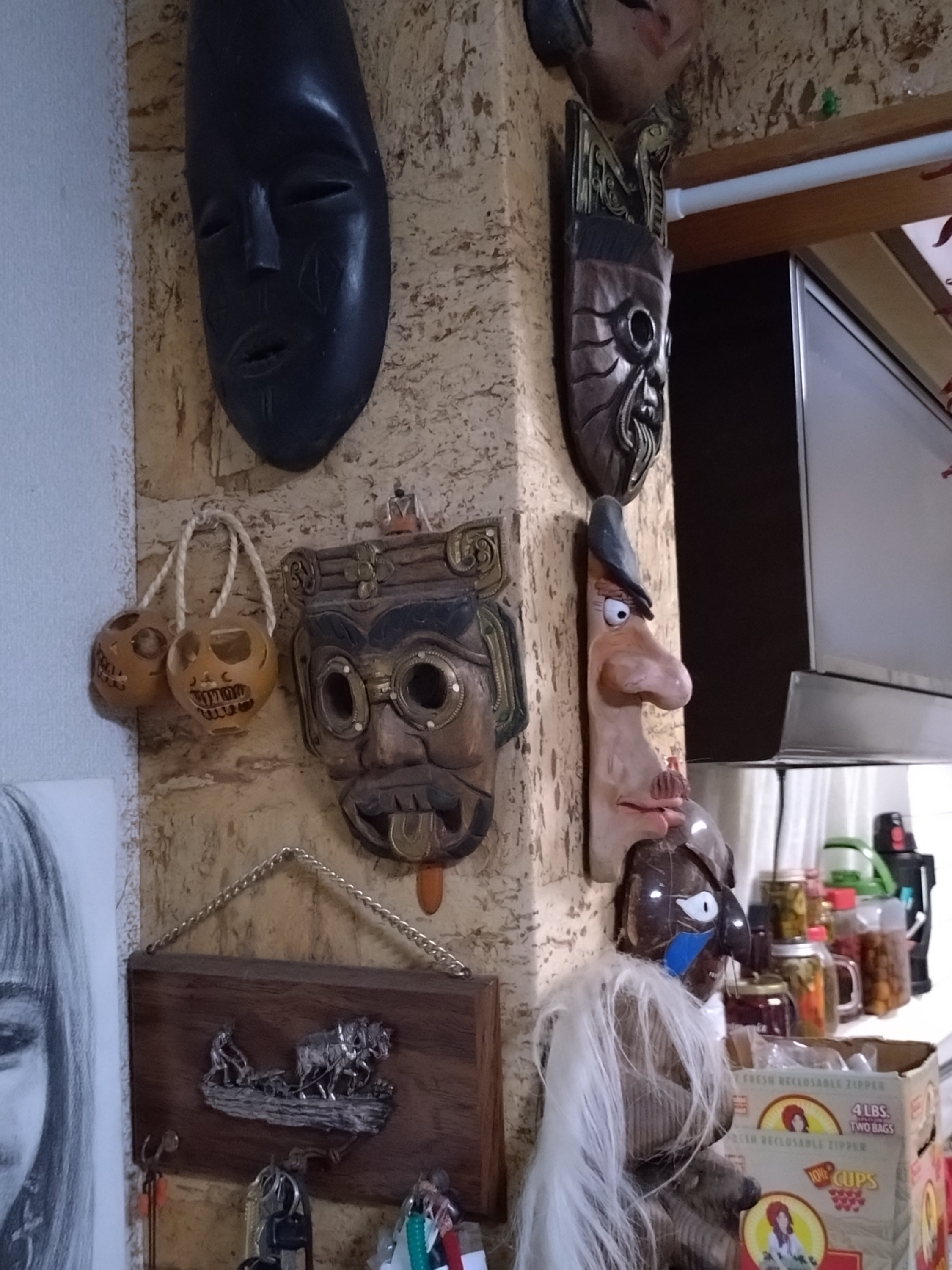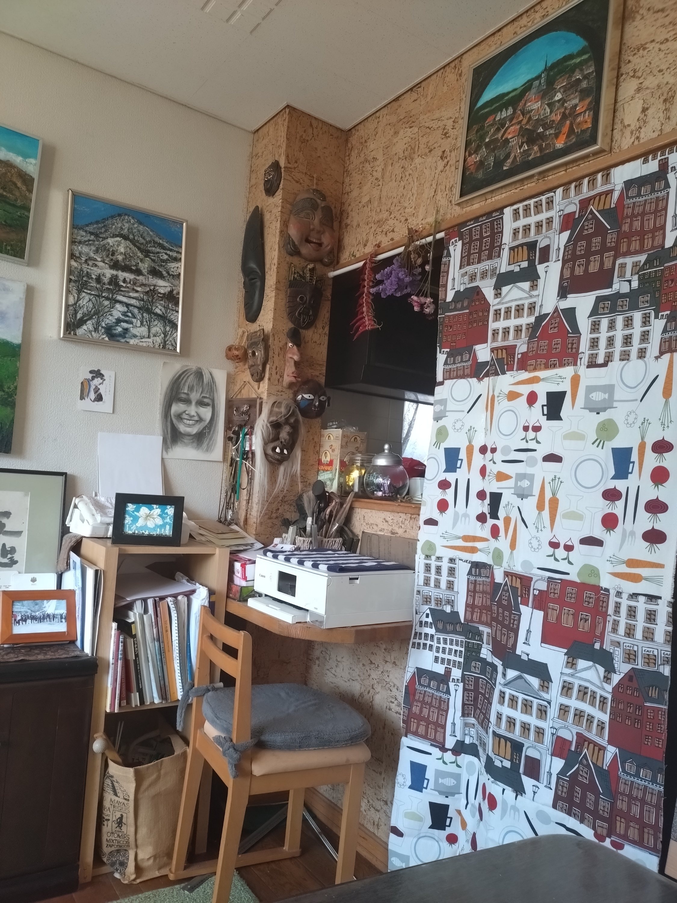 無地を2枚挟もうと思ったのに、好きな模様を2枚ずつ全く賑やかになって、となりの各地のお面たちがビックリしています。(笑)
