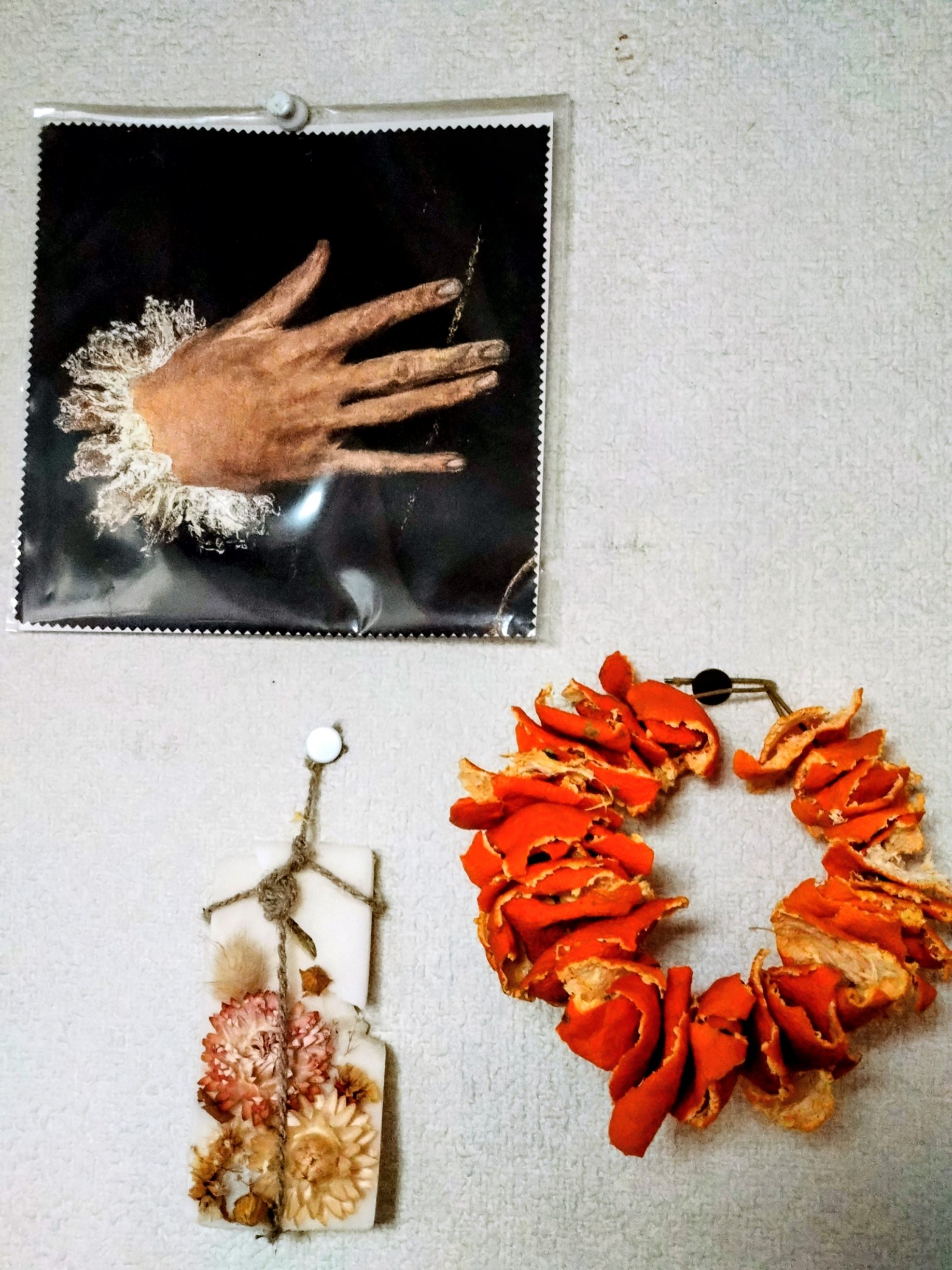 chieko-mobile 2026年1月22日 うちのトイレの壁です。 プラド美術館で買った、「エル・グレコの手のメガネ拭き」とラトビアのドライフラワー付き石鹸。(香りはもうない)と、最近加わったドライのみかんの皮です。 私が最近食べたみかんの皮で次々とワイヤーに刺して行きました。 ← サラサラの雪 ルートいしや →