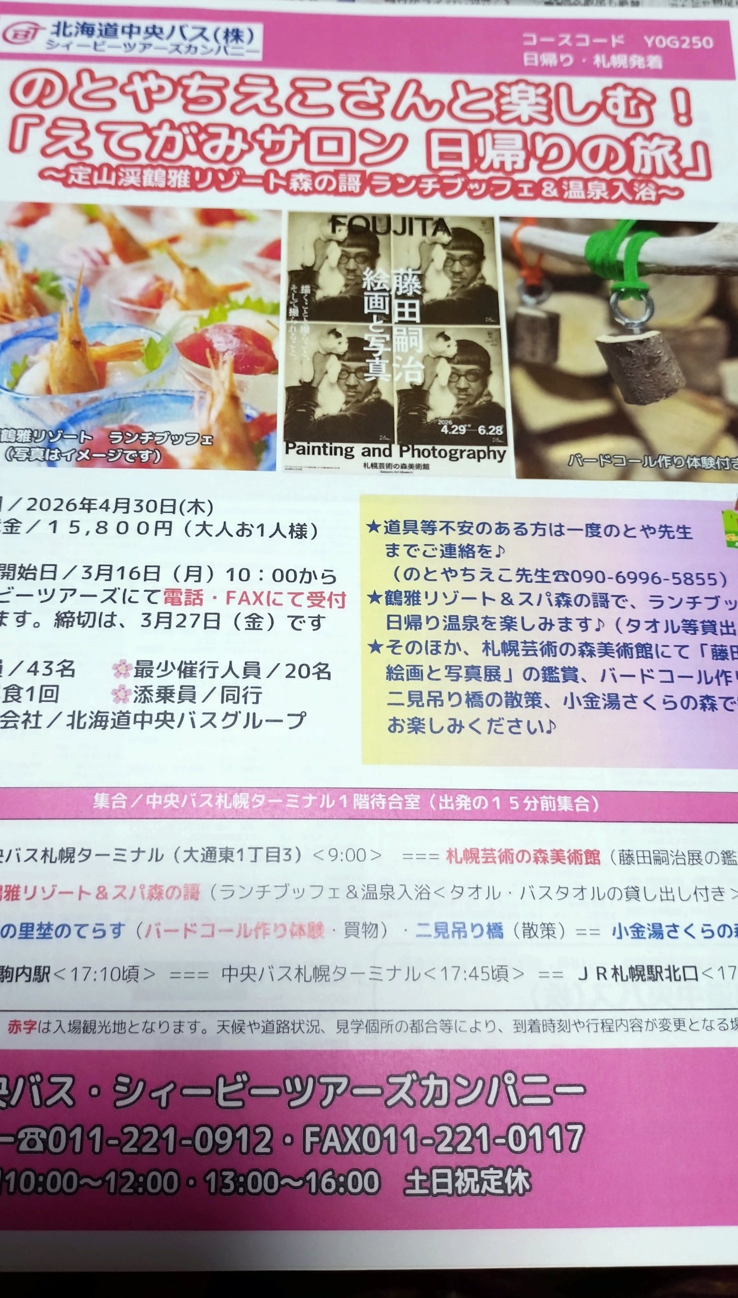 chieko-mobile 2026年3月18日 コメントなし えてがみサロン 日帰り旅の受付が始まりました。 今回は定山渓温泉ゆきです。 芸術の森美術館で藤田嗣治展を見て、「定山渓森の謌」へ、お風呂は入らなくても美味しいご飯をゆっくり食べましょう。 定山渓の二見つり橋や小金湯さくらの森等で、桜を眺めましょう! 今年も3回は日帰り旅をしようと、意気込みはあっても見極められなくて、先の事はわかりませんものねーー。(笑) ← ドングリ 楽しい時間 → コメントを残す コメントをキャンセル メールアドレスが公開されることはありません。 * が付いている欄は必須項目ですコメント 名前 * メール * サイト キャプチャコード*